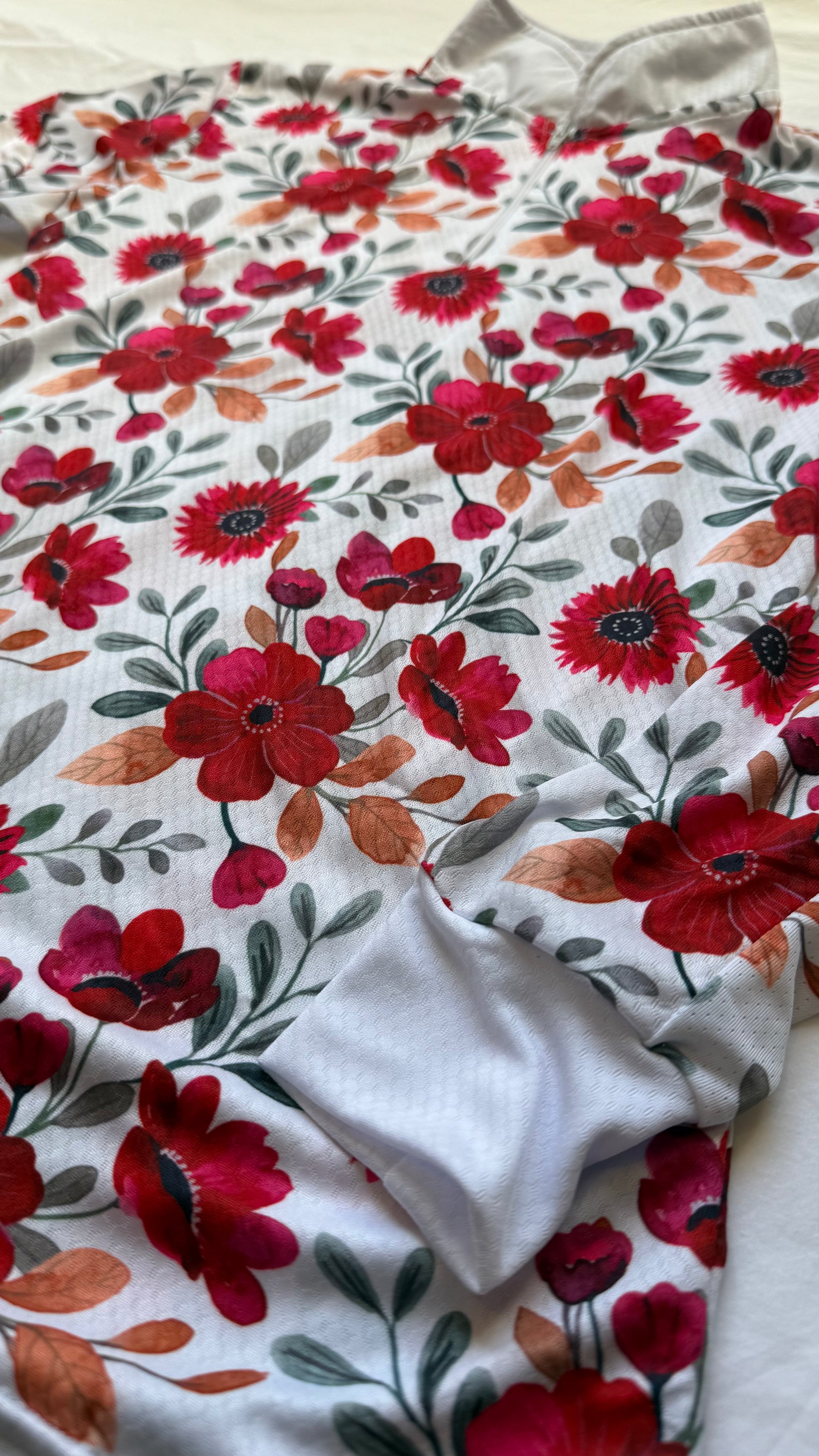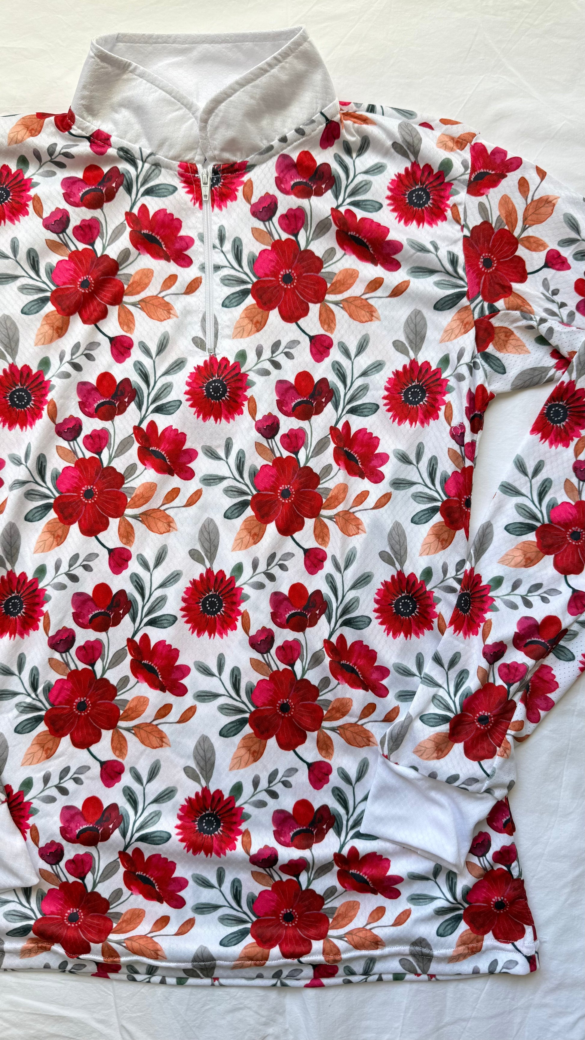 Long sleeve riding sun shirt with breathable mesh arm panels made from light weight prosport fabric. Manufactured Locally.