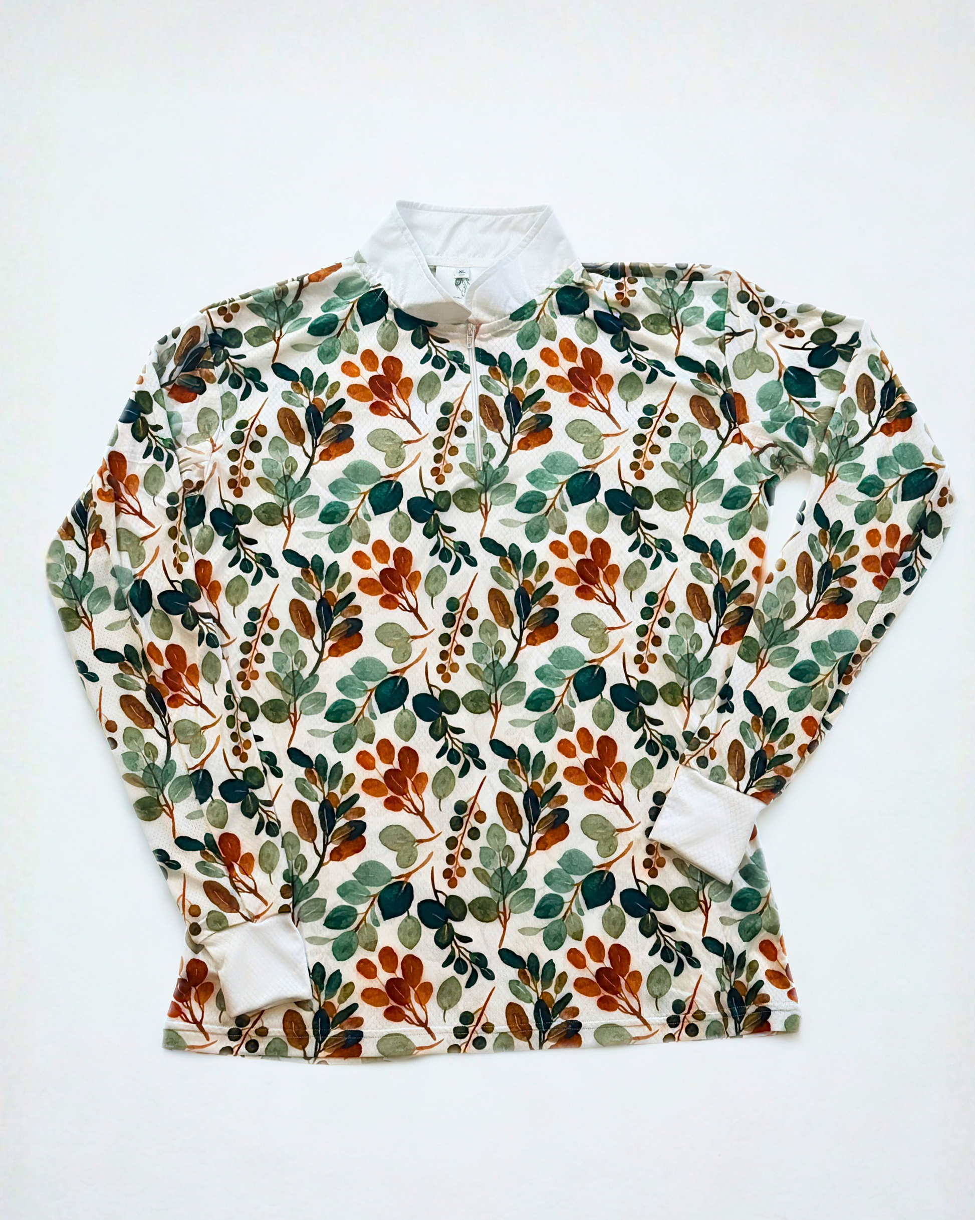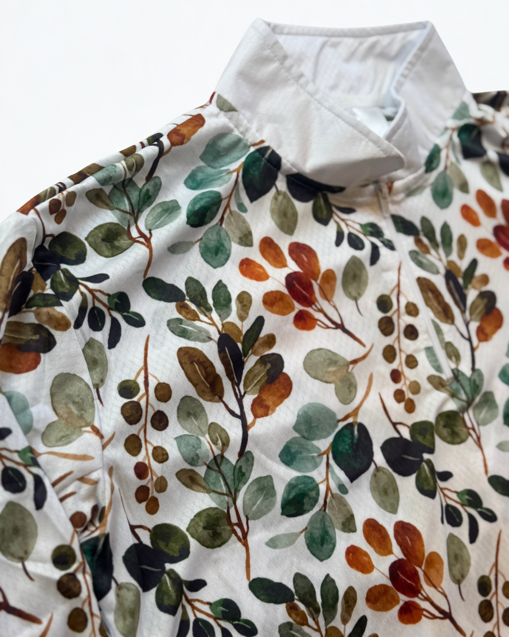 Long sleeve riding sun shirt with breathable mesh arm panels made from light weight prosport fabric. Manufactured Locally.