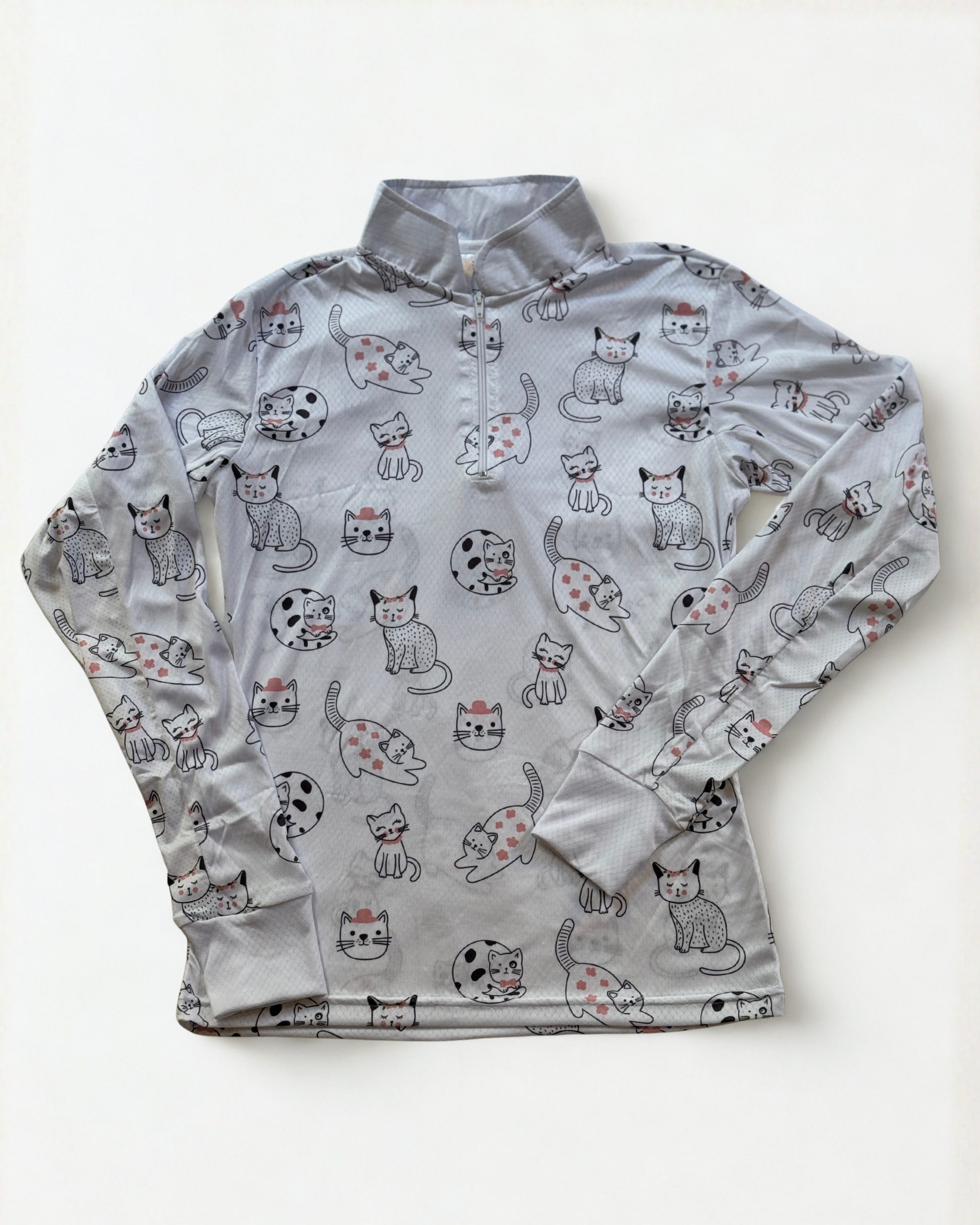 Long sleeve riding sun shirt with breathable mesh arm panels made from light weight prosport fabric. Manufactured Locally.