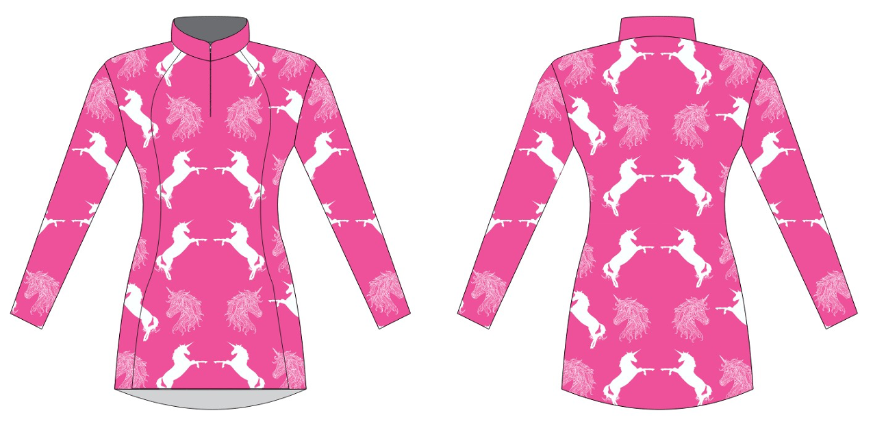 Long sleeve riding sun shirt with breathable mesh arm panels made from light weight prosport fabric. Manufactured Locally.