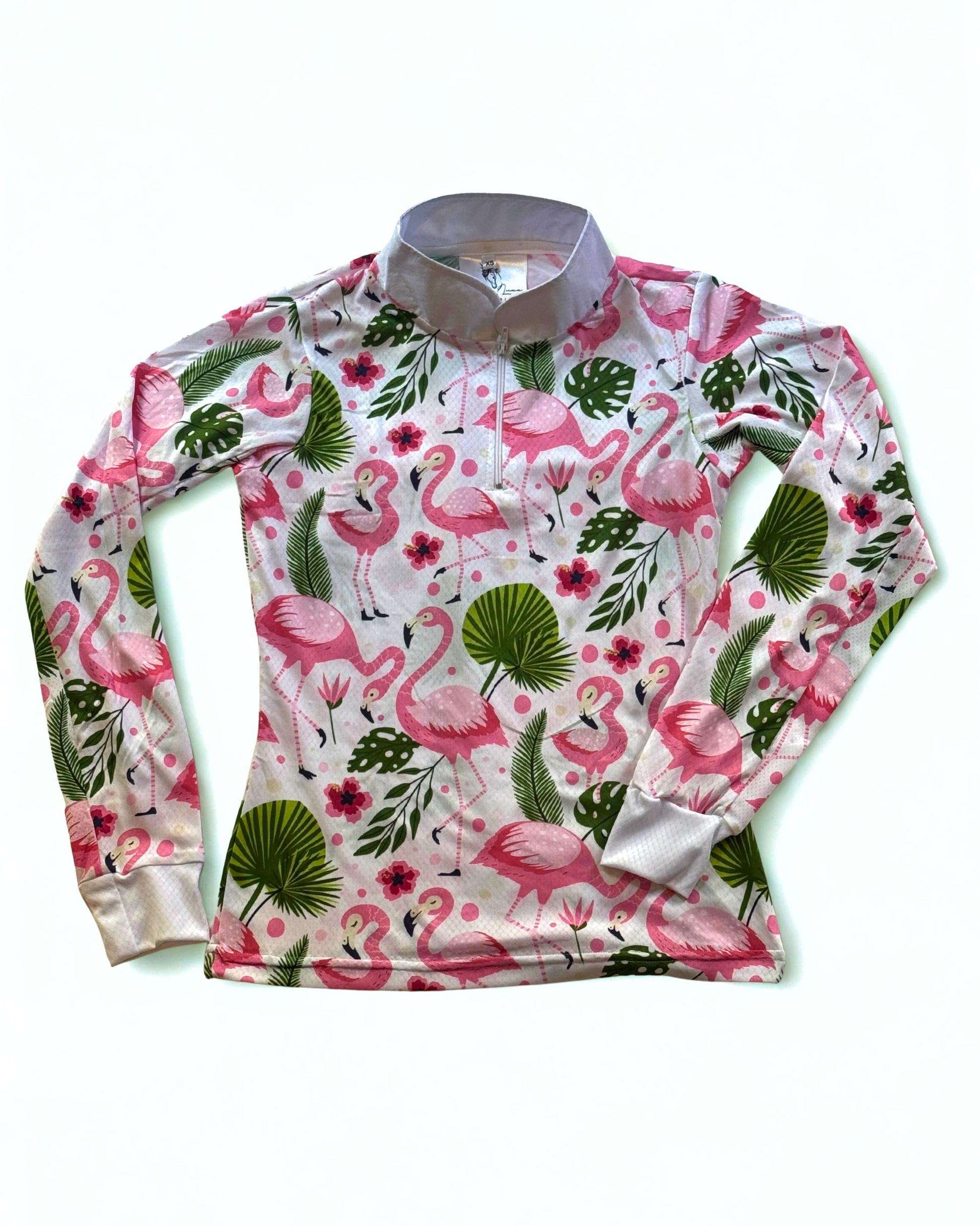 Long sleeve riding sun shirt with breathable mesh arm panels made from light weight prosport fabric. Manufactured Locally.