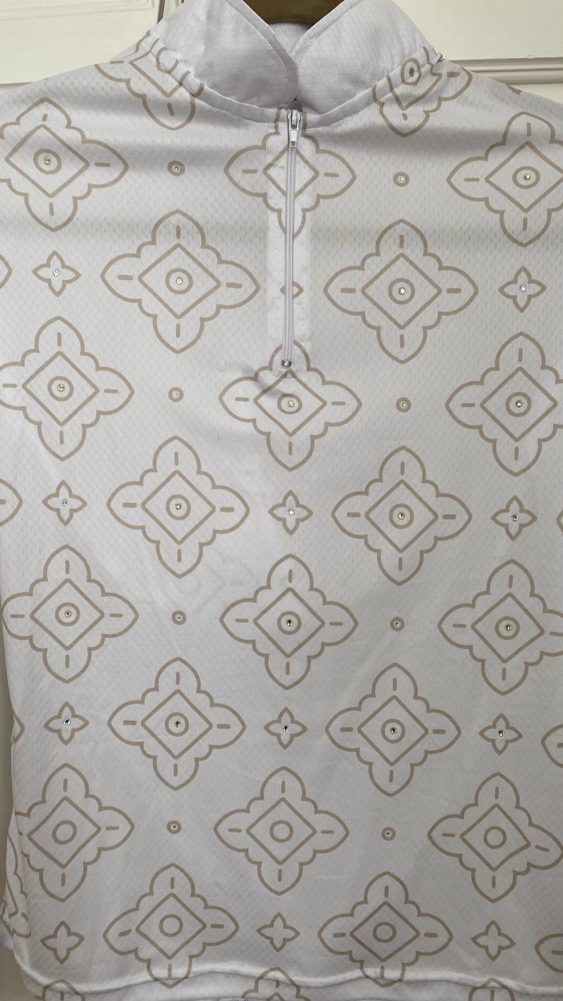 Long sleeve riding sun shirt with breathable mesh arm panels made from light weight prosport fabric. Manufactured Locally.