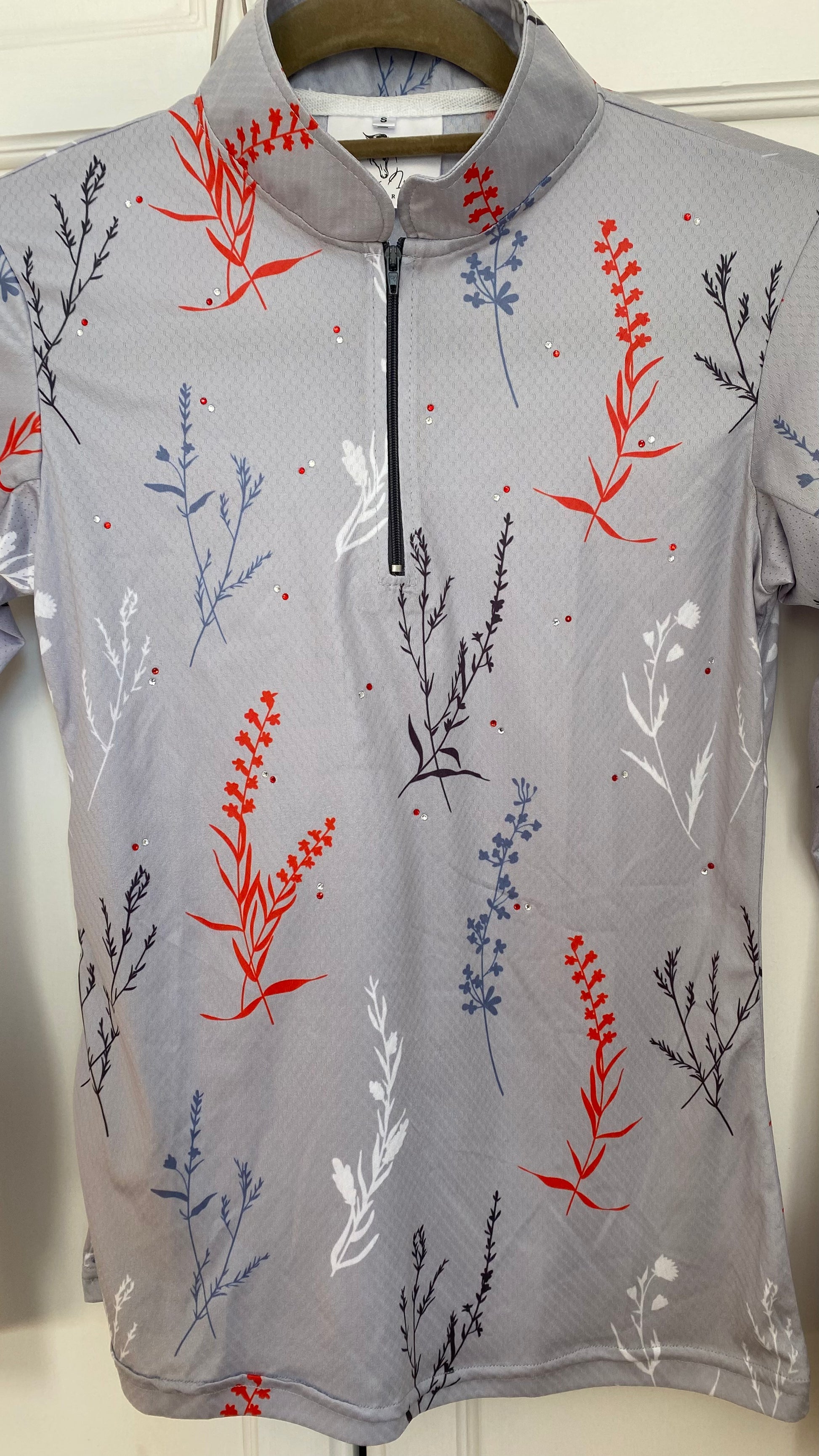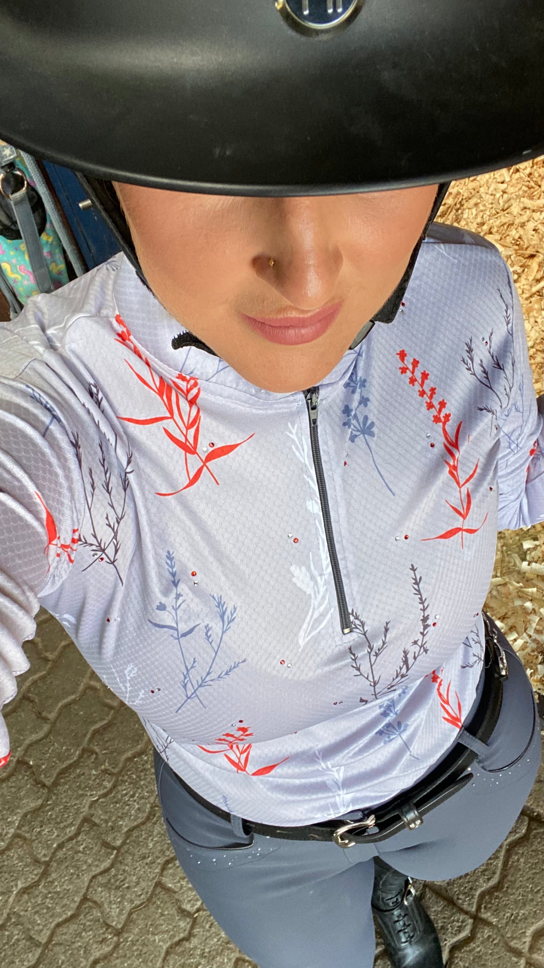 Long sleeve riding sun shirt with breathable mesh arm panels made from light weight prosport fabric. Manufactured Locally.