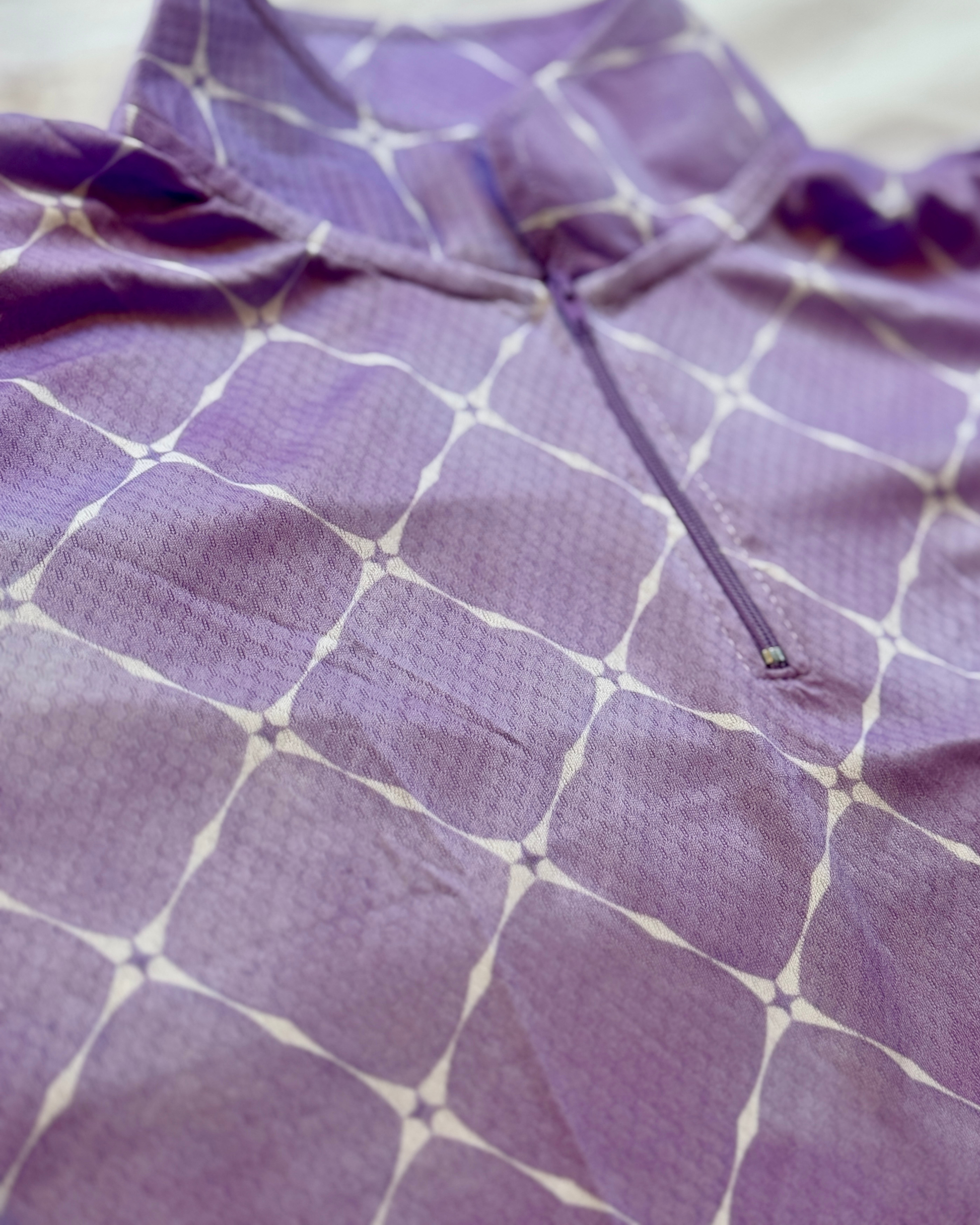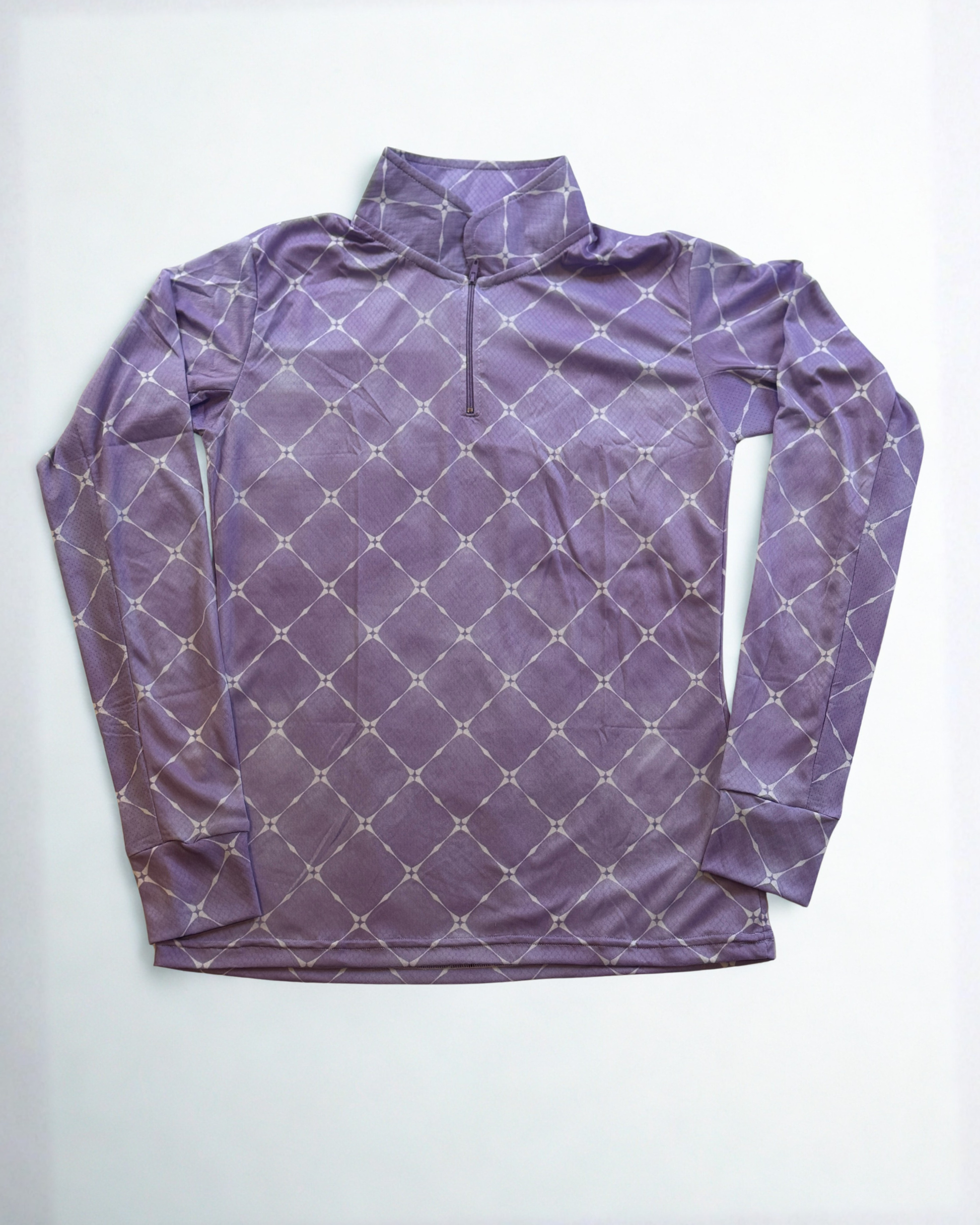 Long sleeve riding sun shirt with breathable mesh arm panels made from light weight prosport fabric. Manufactured Locally.