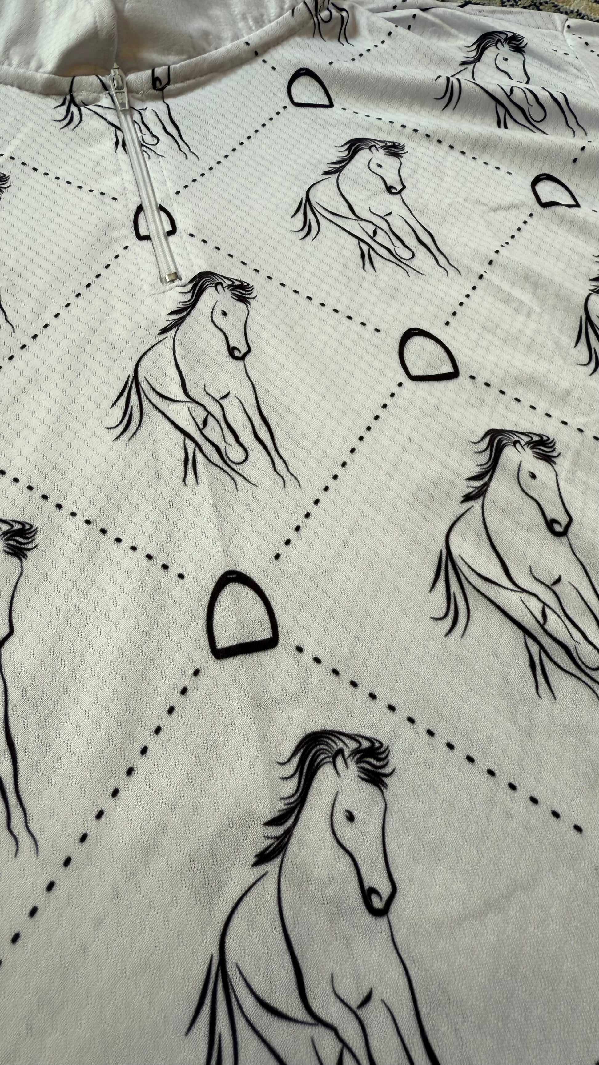 Long sleeve riding sun shirt with breathable mesh arm panels made from light weight prosport fabric. Manufactured Locally.