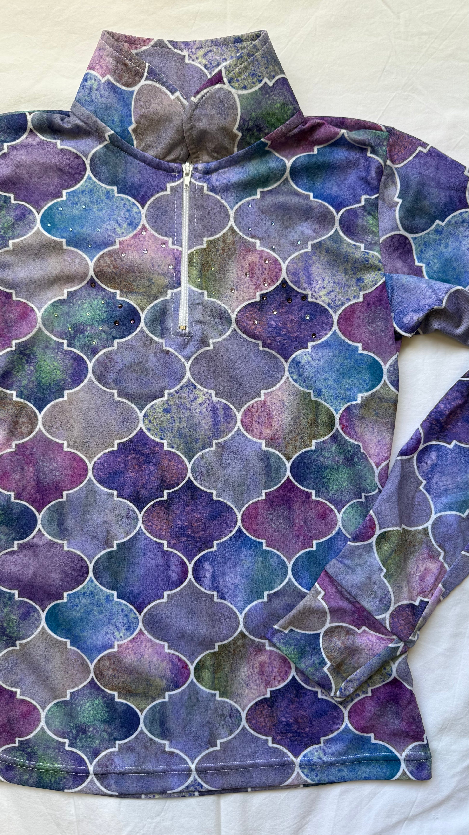 Long sleeve riding sun shirt with breathable mesh arm panels made from light weight prosport fabric. Manufactured Locally.