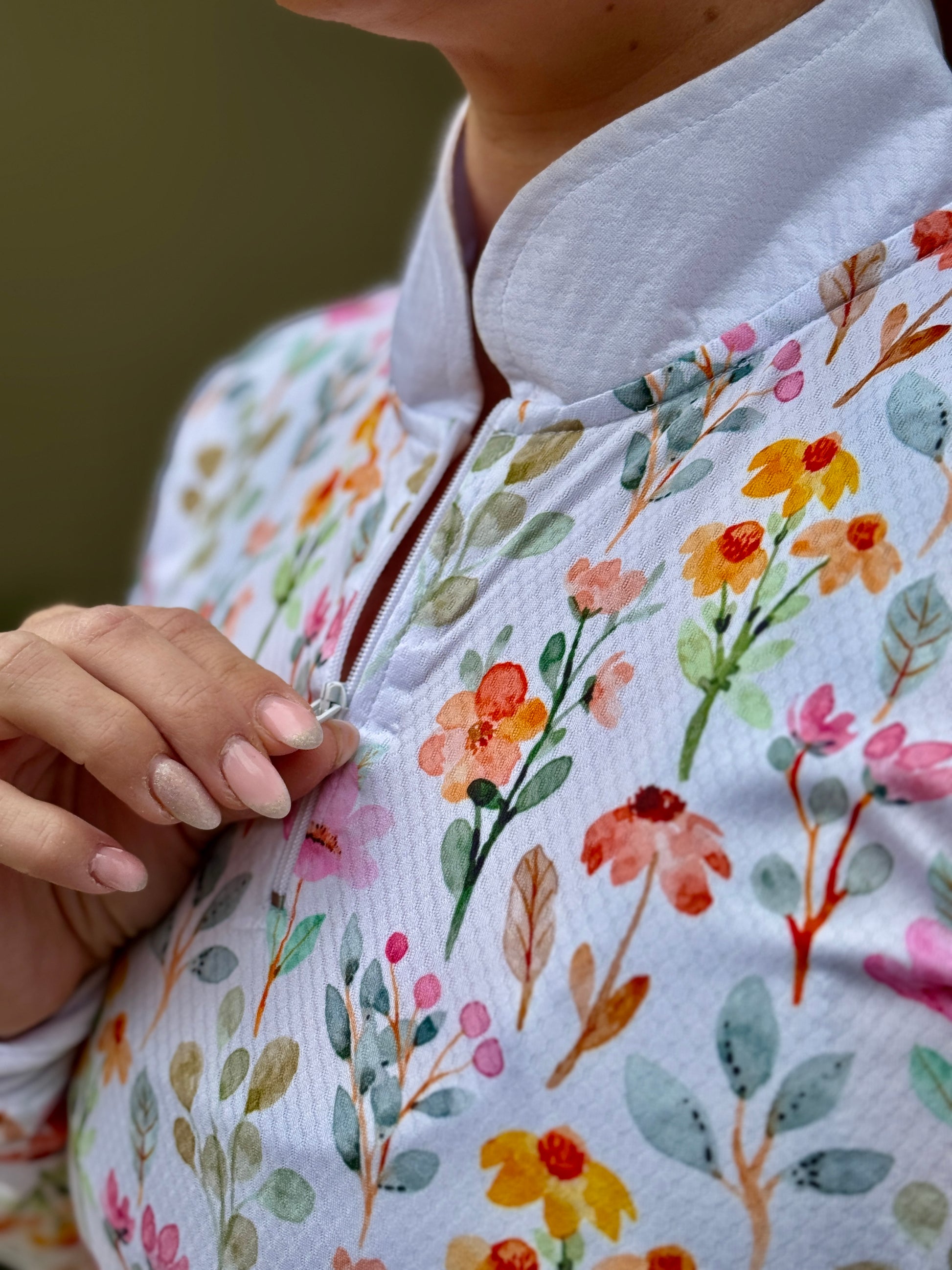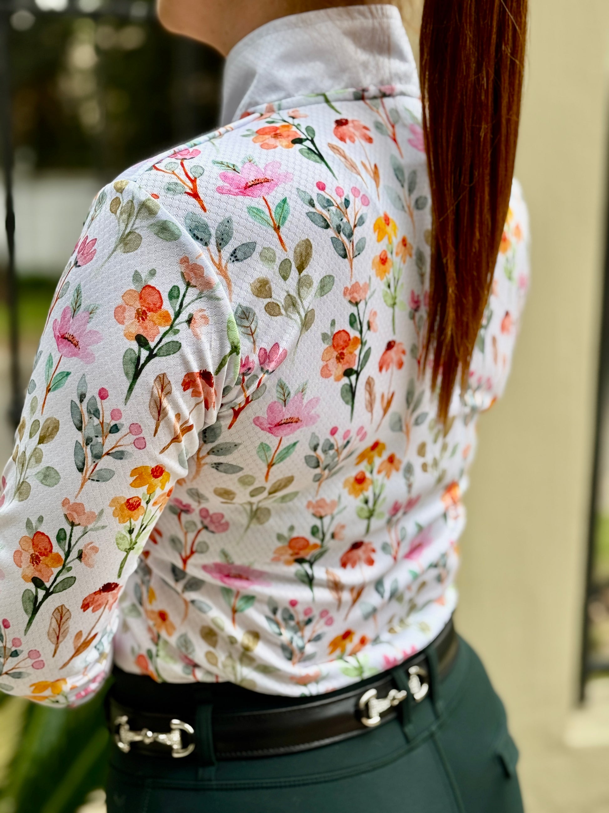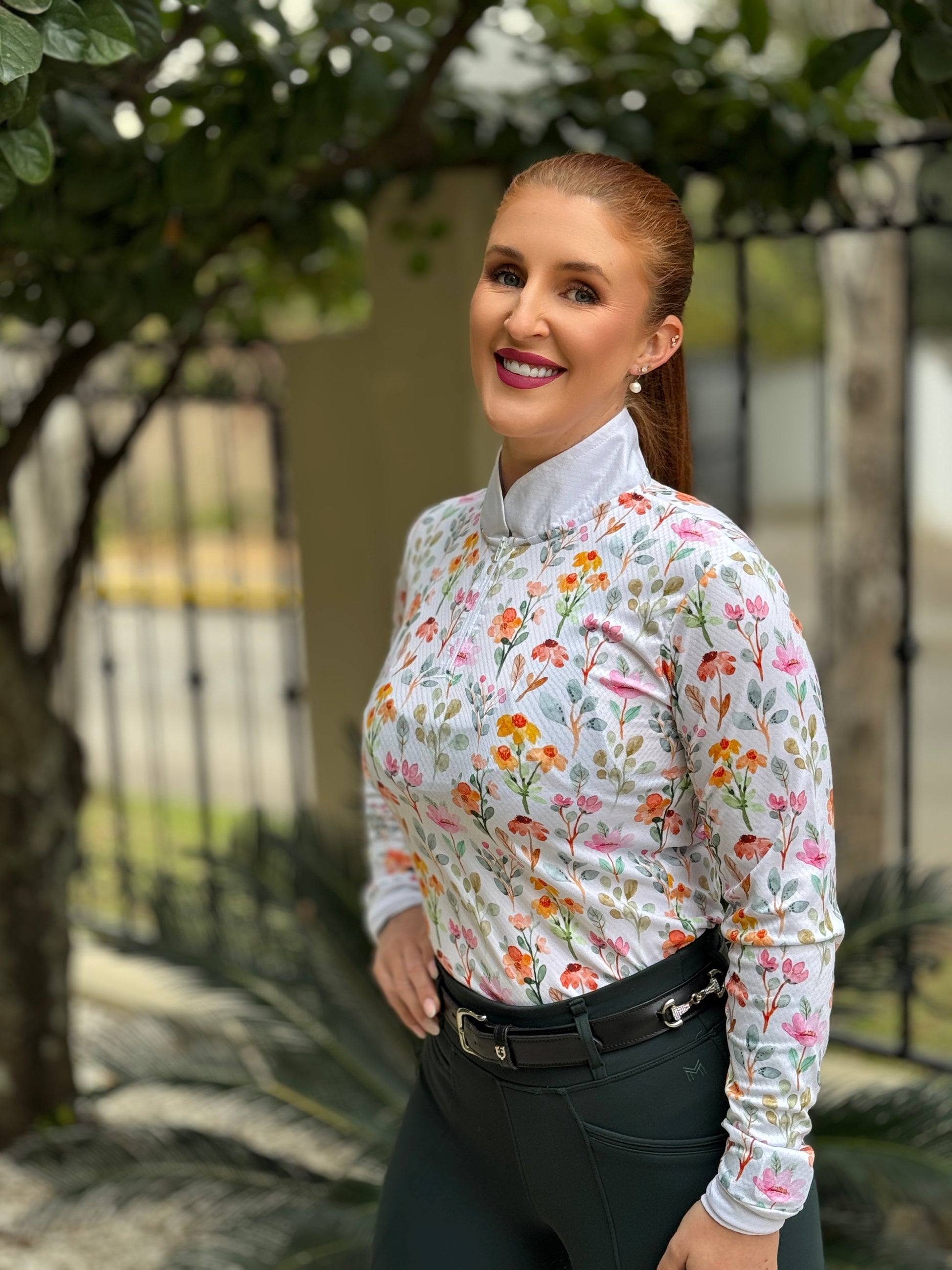 Long sleeve riding sun shirt with breathable mesh arm panels made from light weight prosport fabric. Manufactured Locally.