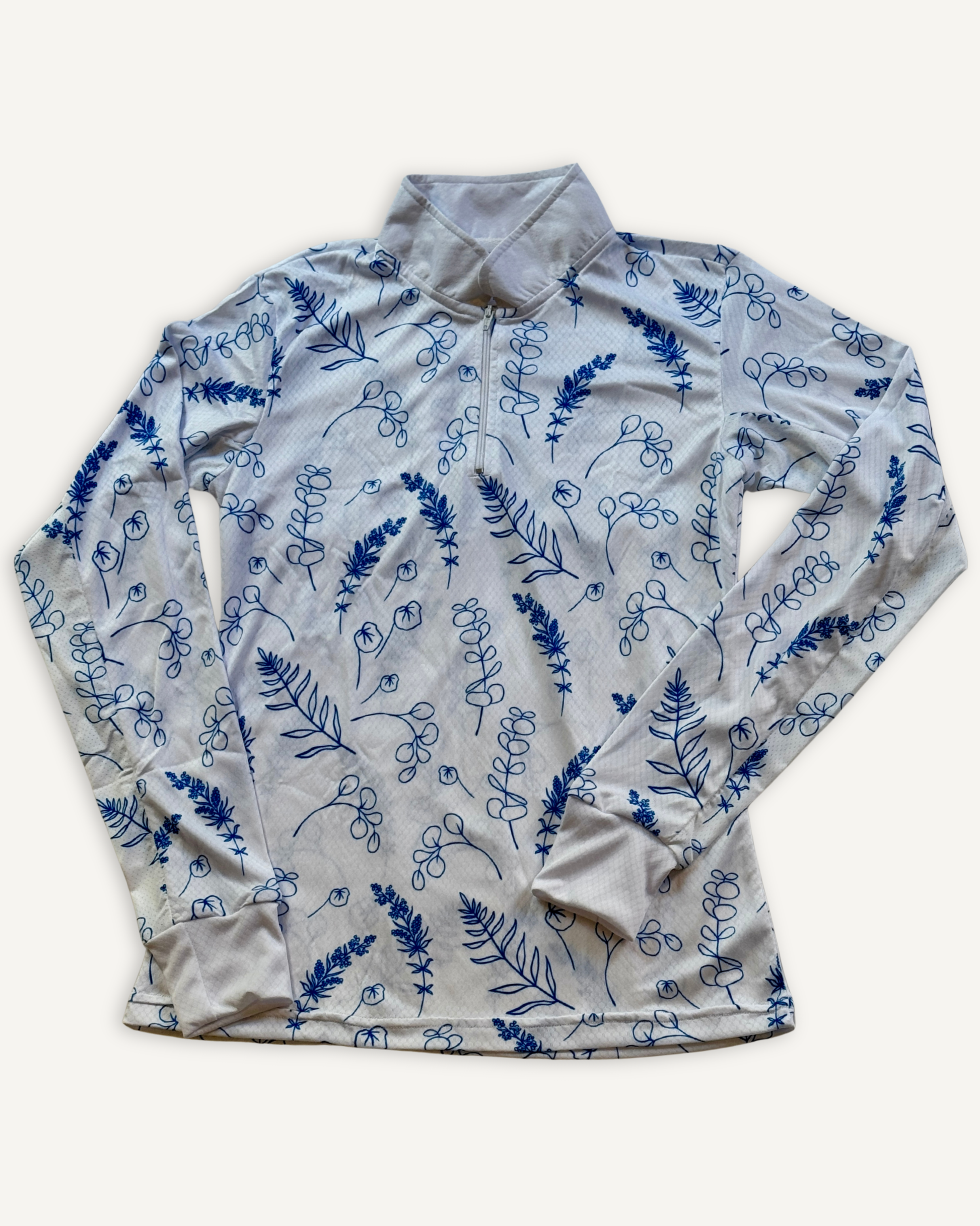 Long sleeve riding sun shirt with breathable mesh arm panels made from light weight prosport fabric. Manufactured Locally.