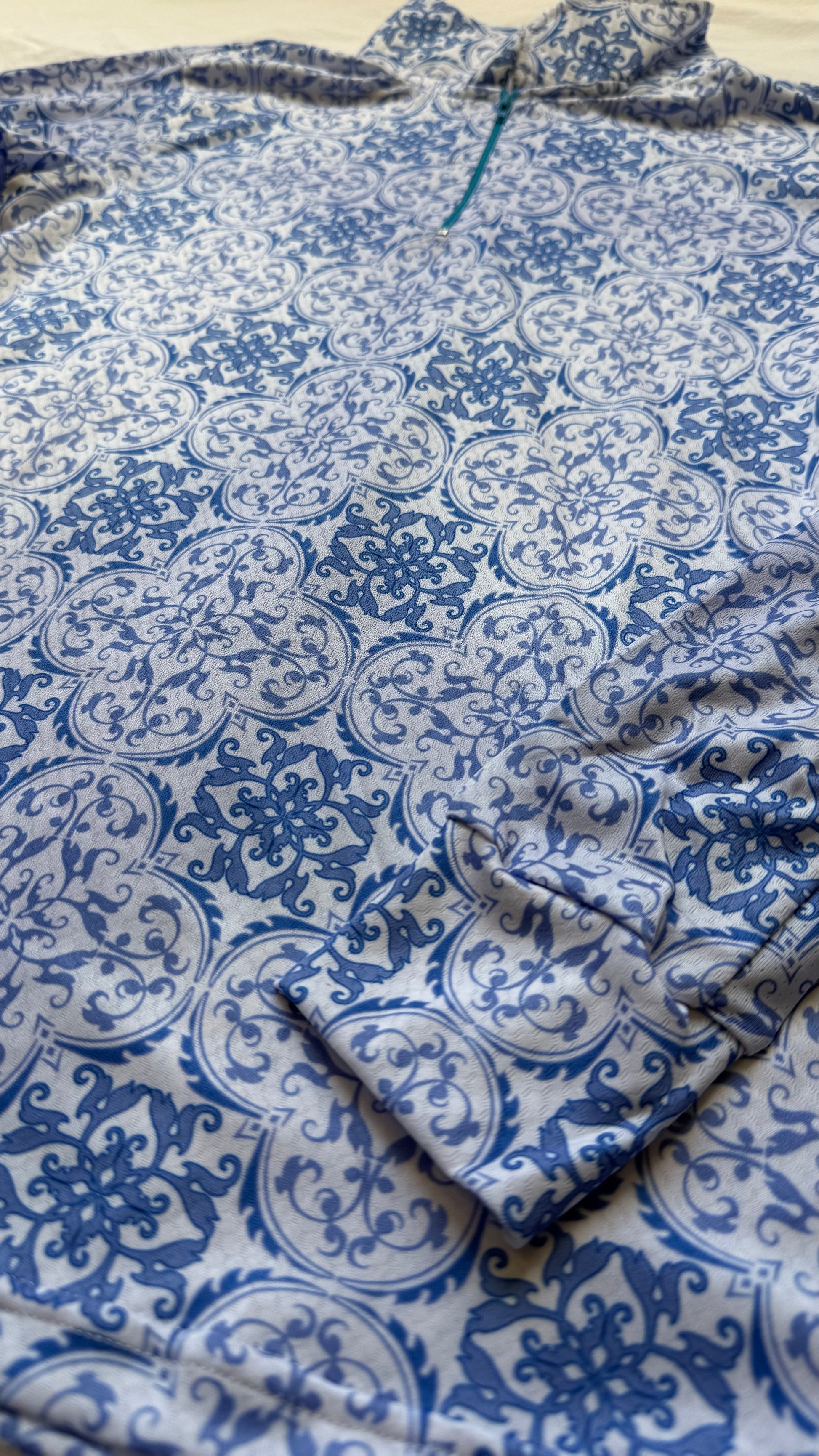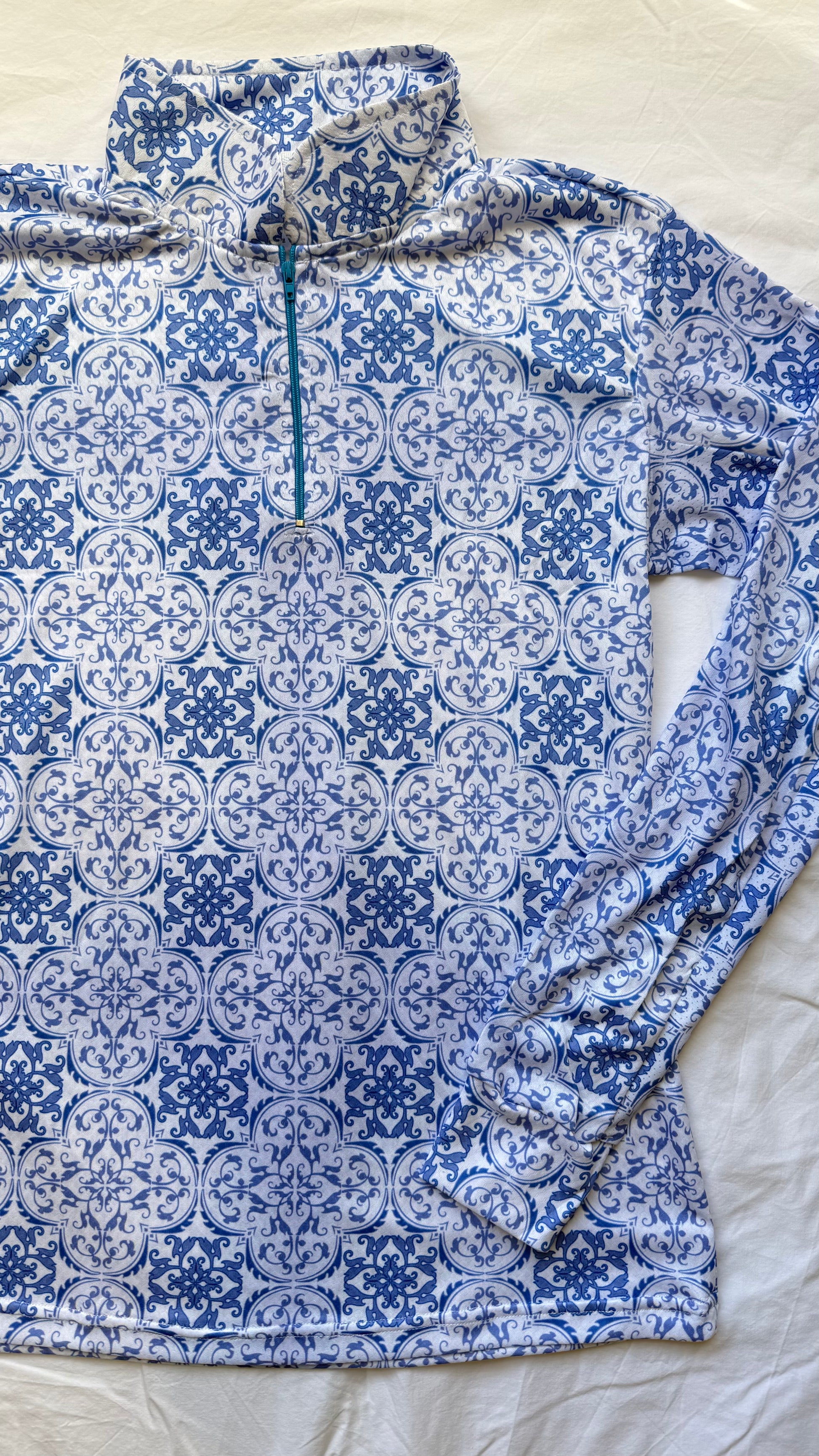 Long sleeve riding sun shirt with breathable mesh arm panels made from light weight prosport fabric. Manufactured Locally.